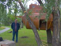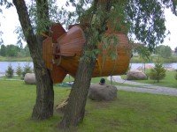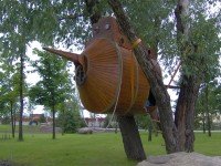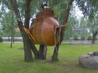 Легенда: разлился Днепр. Плыла подводная лодка. Запуталась в ветвях. Вода спала, а она осталась висеть на деревьях.